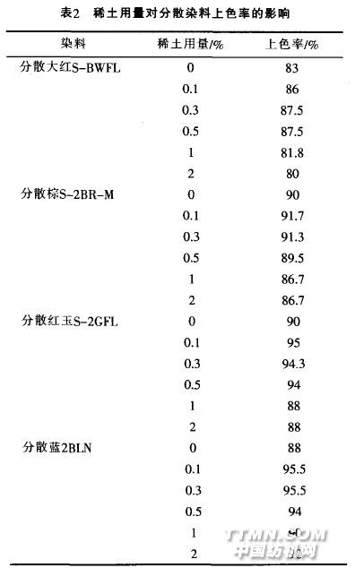 可以看出稀土用量在0.1%~0.3%时.其上色比常规染色有所提高,脚水清澈.不用稀土或用量超过0.5%时,上色率明显回落.脚水色泽相对较深.所以加稀土用量应适当,不可任意多加从稀土的染色机理来看.稀土与染料分子中的羟基氧原子、偶氮基的氮原子和磺酸基的氧原子间存在络合作用.从而使染料分子量增大.导致染色色泽加深.染料和纤维非极性部分之间的分子间作用力增大.上染率和色牢度也因而有一定程度的提高 稀土在染色过程中的作用体现在稀土对染料的作用:稀土对纤维或织物的作用。另外.郑雄利用稀土氧化物的特征.将其与其它碱土类金属的硫酸盐经高温烧结.制成具有吸收并蓄积光能的自发光材料.作为涤纶织物或麻棉织物的染色或印花的增深增艳剂使用。经测试,这种自发光材料具有较强的余辉效应.无放射性,对环境不产生污染.将稀土自发光材料制成印染加工的添加剂.在染色和印花工艺中使用.可改善和提高印染成品的外观质量.获得明显的增深增艳效果.其增深增艳作用是由于稀土氧化物自发光材料的长效吸光特性和蓄积能特性.具有反复吸收光能和释放长波的功能所致。