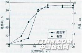 3.2不饱和蒸汽汽蒸退浆精练工艺3.2.1 处理时间的确定 将热水水洗后的织物,采用2.2.2不饱和蒸汽汽蒸进行退浆精练工艺,淀粉酶A浓度1g/L,碱性果胶酶B浓度1 g/L,处理温度60℃,比较不同处理时间对织物退浆率和毛效的影响,其结果见图4。