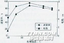 图5处理温度对织物退浆率和毛效的影响如图5所示,处理温度为30℃时,织物毛效很低,退浆率仅在50%左右;处理温度大于30℃,退浆率逐渐增加,织物毛效上升也很快;处理温度为60℃,退浆率和毛效都已达到传统碱汽蒸前处理工艺要求。继续升高温度,退浆率和毛效反而下降。所以,对两种酶的不饱和蒸汽汽蒸退浆精练工艺来说,处理温度以60℃作用效果较好。