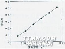 2.2.2不饱和蒸汽汽蒸工艺 配置工作液→浸轧→不饱和蒸汽汽蒸处理→出布→95℃热水洗→65℃温水洗→冷水洗→105℃烘至恒重→测试相关性能 工作液处方,g/L 淀粉酶A 0.2~1.0 碱性果胶酶B 0.2~1.0 渗透剂JFC 1.5 pH值(用磷酸-磷酸钠缓冲溶液调节) 8~92.3测试方法2.3.1退浆率测定 精确称取淀粉(50±0.1)mg,溶解于20 mL左右42%的高氯酸中,加入6 g/L的NaOH至溶液呈淡红色,再加2 g/L醋酸至淡红色消失。转移至50 mL容量瓶,用蒸馏水稀释至刻度,吸取规定量的该溶液于50 mL容量瓶中,加入2g/L醋酸24 mL,10%KI 0.5mL.0.05 moL/L的KIO32 mL,以蒸馏水稀释至刻度,以空白溶液为参比,于(25±1)℃下测定吸光度作为纵坐标,绘制标准曲线(如图1)。