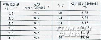 2.2氯漂2.2.1 工艺流程及工艺处方 煮坯纱牵引→松扣→浸漂(NaCl0,有效氯含量2.8g/L)→沥水氧化→淋冲水洗→酸洗(硫酸2g/L)→沥水淋冲→脱氯(硫代硫酸钠8g/L)→沥水冲洗→出池水洗(温度为室温)2.2.2有效氯含量对漂白效果的影响表2有效氯含量对漂白效果的影响