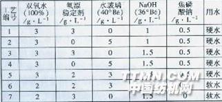 由表2可知,氯漂时有效氯含量应控制在2.8g/L左右,过低白度不够、毛效不高;过高则纤维强力损伤严重。经氯漂后纱线毛效可达8~9 cm/30 min,白度值一般约为36,可直接用于深色、中深色的染色。2.3氧漂 采用高压锅氧漂2.3.1工艺处方及流程 工艺处方/g·L。 双氧水(100%) 3 非硅型氧漂稳定剂 2 NaOH(36。Bé) 1.5(调pH值至10.5~11) 水玻璃(40。Bé) 3 焦磷酸钠(软水剂)0.5 工艺流程 氯漂纱线装笼→前处理(95℃X 10 min)→水洗→室温入漂→升温至95℃保温50 min→水洗→酸洗(冰醋酸2 mL/L,40 ℃×10 min)→水洗(pH值7~8)→出笼水洗2.3.2氧漂工艺条件的选择试验(表3、4) 表3氧漂工艺条件选择