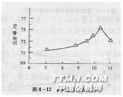 碱性采用双氧水练漂时,当pH值在7—9.3范围内,白度增加很少。但当pH值超过9.3后,白度能迅速提高(图4—11)。达到10.3时为最高峰。这与双氧水的分解曲线十分相似(图4—12),在接近pH值为10.3时达到顶点。