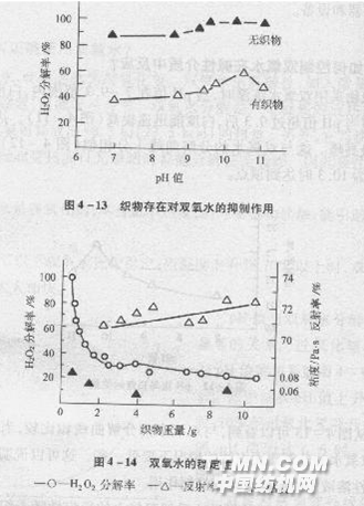 从图4—13可以看到,与双氧水的分解曲线相比较,当织物存在时,双氧水的分解比无织物的情况下要低一些。这可以说明织物对于在碱性溶液中的双氧水起着抑制作用。 从图4—14中可以明显地看到双氧水的稳定性随着织物的加入而提高。另一方面纤维素能从溶液中吸附碱的特性,随着织物的增加而增加。这样降低了羟基离子的浓度,从而使分离速度受到抑制。但从实践中证明,纤维素吸碱并不是重要的因素。