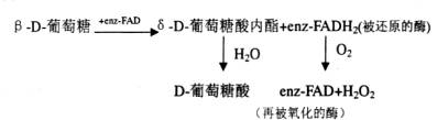 如N-羟基苯三唑(N-hydroxybenzotriazole,HBT)及紫尿酸(Violuric acid),其效率和毒性方面尚存在问题。二是,过氧化物酶,它通常是促进各种氧化剂的活化,例如过氧化氢酶用于除去织物上的过氧化氢(双氧水)的分解,迄今未见于漂白方面的报导。三是葡萄糖氧化酶是最有希望的,它对B.D.葡萄糖有很强的专一性,能使葡萄糖在有氧气参与的情况下,催化生成过氧化氢(H202)和葡萄糖酸内酯(Gluconolactone),其简单的催化反应如下: