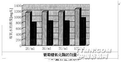 图1表明,葡萄糖氧化酶能产生足够的双氧水浓度,同时,如处理浴中有布存在时,有利于双氧水的生成,达