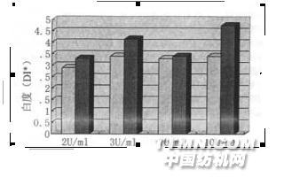 图2表明,酶漂白织物的白度与葡萄糖氧化酶剂量和PH的关系,由以前试验可知,双氧水浓度随施加剂量提高而提高,PHl0比PH7的漂白效果好。然而,葡萄糖氧化酶达一定剂量,白度会到达某一水平后就没有相关性了,疑似由葡萄糖酸内酯增加而导致生成过量的葡萄糖酸的稳定作用所致。