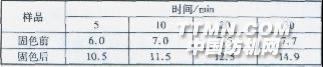 由表3可知,固色整理前后,锦纶织物颜色指标的变化很小,表明耐氯增进剂Argafix CL固色整理对染色锦纶针织物本身的色光几乎没有影响。2.3.2对织物手感扣吸水性能的影响 测试耐氯增进剂Argafix CL固色整理前后锦纶针织物的手感和吸水性,结果见表4。表4整理前后织物的毛细效应/cm