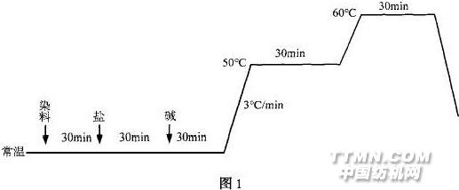 1 前言 活性染料以其优良的使用性能在针织物印染中有较广泛的应用,而乙烯砜类染料(KN 型) 在各印染厂使用更为普遍。但此类染料的反应性和扩散性较均三嗪染料(X型、K型)为中等,而通常的染色工艺为中温染色、固色,中温加碱剂,这样在大样生产中极易造成条花和白斑,尤其是深蓝、军蓝等深浓色,并且染出的坯布手感粗糙、颜色灰暗。本厂在近几年的染色中,对KN 型染料在常温机上染棉针织物的染色工艺,进行了不断地实验,对此,终于成功地摸索出一套成熟的染色工艺。2 染色机理 乙烯砜类活性染料( KN型) ,通常以较稳定的β- 羟基乙砜硫酸酯形式存在,染色时在碱性介质中先脱去硫酸酯基,形成活泼的乙烯砜基后,再和纤维素发生亲核加成反应。3 染色过程3.1 工艺流程 坯布进缸→漂底→水洗→热洗→水洗→染、固色→水洗→酸洗→水洗→皂煮→水洗→柔软出布。3.2 工艺曲线(见图1)