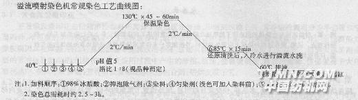对轻薄型织物来说,如果转速太快,喷嘴压力越大织物接触导布辊的几率便越多,织物交织点往往会因此而产生滑移(纰裂),相反,则会使织物滞留在储布槽内,容易产生色花。即便是比较容易染色的织物,也不要超载。超载的结果,不仅因织物在储布槽内堆积时间长,加之织物在机内滞留过程中难免因受热不匀引起色花,而且往往还会因机内的染液流动快慢导致织物打结和堵布等现象。现在的溢流喷射染色机最小的浴比有l:6,多数均为1:10,总的来说,染色的质量优劣不能孤立地看浴比大小,更重要地是看整机的设计是否合理,机电的可控性等而定。从染整角度讲,要做到浴比定得恰当与否,还是要看整体的染色质量。(2)化料与加料。严格地说,用于染涤纶的分散染料的化料与加料很有讲究,否则都会不同程度地影响溢流喷射机的染色质量。因为分散染料本身是一种非离子性的疏水性染料,在商品化时填充了扩散剂MF,有的甚至还是用NNO(不耐高温),还有木质素磺酸钠,防尘剂等,因为大量的扩散剂属阴离子,所以卖给染整企业的分散染料商品也成了阴离子染料,由于它的溶解度很低,室温时为0.1—32mg/L,因为扩散剂具有增溶作用,所以分散染料的溶解度是随染液温度的提高而提高,如到130。C时它的溶解度是200 mg/L以上,但无论如何,它在水中总是呈极细小的颗粒悬浮液进行染色的。首先,它只能采用30℃左右的温水加料。如果化料水温太高,反而会使染料产生聚集倾向,有时虽经搅拌,甚至筛滤人缸,但进入染浴后还会发生二次凝聚,很容易在染色时产生斑点导致染疵。其次,要注意加入染机时的速度和浓度。实践证明,一般应稀释至1:10(即lkg染料或助剂要用lOkg的水稀释)宜多而不宜少,然后用5一lOmin缓慢注入染机,不宜燥之过急。(3)升温、保温与降温。这个问题总的也要看具体产品而定,它和染色时采用的染料品质,以及助剂的合理使‘用有一定关系。我在这里