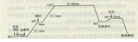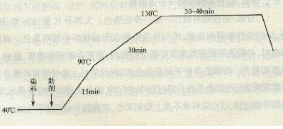 涤棉混纺针织物以纬编单面织物居多,混纺比有65/35、35/65、50/50等。交织针织物一般是纬编双面织物。涤棉比例不同,产品性能不同,适宜的染色方法和工艺也不尽相同。涤棉混纺(交织)针织物中涤纶一般用分散染料高温高压染色,棉通常采用直接、活性、还原等染料染色。选用两类染料对涤棉混纺(交织)织物染色时,不但要注意减少相互沾色,还要求两类染料的染色牢度接近。相容性好的染料,可采用一浴法染色,相容性差的染料,采用二浴法染色。具体染色方法可根据色泽要求、染化料情况等因素确定。(一)一浴一步法染色1.分散染料一浴一步法染色 涤棉混纺针织物的浅色产品或涤纶比例较高的产品,可只用分散染料对涤纶染色,无需套染棉,工艺简单。染色采用高温高压法,染色后进行还原清洗,去除沾色和浮色,染色处方和工艺参照分散染料染涤纶针织物。2.分散/活性染料一浴一步法染色(1)分散脂性染料碱性一浴一步法染色。大部分K型、KN型、KD型、M型活性染料耐高温,可与分散染料在弱碱性浴中同浴染色。碱性染色时,必须选用耐碱性能良好的分散染料,否则会被碱剂破坏,影响上染率和色光。在碱性条件下同浴染色时,活性染料上染纤维素纤维并和纤维素纤维反应固色是在升温过程中进行的,因此必须控制好升温速度,如果升温过陕,活性染料来不及上染和固色,在高温下水解速率增加。工艺流程:分散/活性同浴染色→水洗→皂洗→水洗染色配方:分散染料x%,活性染料y%,硫酸钠30—60g/L,碳酸钠0.1—4g/L,扩散剂NNO 0.5一lg/L,平平加O 0.3—0.6g/L,防染盐SO一0.5g/L。升温曲线: