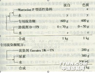 Emvatex DK一TN专用拔染糊为20%的浆状物,pu值为12.5—13.0。 该拔染专用糊对被拔染的Marcozol CDR系列染料结构的选择性如下: ①染料母体为单偶氮结构的活性染料,其活性基团接在染料重氮部分的拔白性能优于活性基团接在偶合部分的活性染料。 ②染料母体为金属络合的活性染料,其拔白性能比不含金属络合物的染料差,其中铬络合、镍络合染料比铜络合染料差。 ③染料母体为酞菁结构或溴氨酸结构的活性染料,其拔染性能差.不能拔白。助拔剂Cleantex DK一TN配合拔染剂Emvatex DK一TN