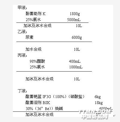 .png) 2.化料方法 甲液:把酞菁助剂K放瓷缸中,加入冰水2—3L,调匀后加入氨水搅匀成深蓝色铜氨溶液,加冰冷却,盖好容器待用。 乙液:将尿素用热水溶解于搪瓷缸,冷却后待用。 丙液:将醋酸放入容器,加并冷却,再加入氨水即可。 丁液:染料先置于搪瓷缸内加入少量冰水,调成浆状,再加入溶剂搅均匀。加冰块、烧碱搅匀。次序不能搞错。 上述四种溶液需事先溶解好。临用时,先把乙液倒入搪缸内,并把丁液用细布过滤去杂,加入同一缸内,加适量冰搅匀,再倒入甲液,最后加丙液搅匀,加水合成100L。配好的染液PH值应在9.5—11为宜,不宜放置过久,应尽快用完。 由于市场上已有酞菁蓝游离碱的染料供应,因此,这种用酞菁艳蓝IF3G(硝酸盐)轧染的方法已不大采用。