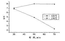 | (a)不同改性剂EP浓度和温度对织物表观深度的影响(改性时间5Omin) | (b)不同改性时间和温度对织物表观深度的影响(改性剂EP浓度 |