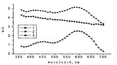 从图6可以看出,碳黑和分散染料同时上染涤纶时上染率略有下降,这说明碳黑和分散染料具有较好的染色相容性,因此可以用不同颜色的分散染料来调整色光,另外从图6还可以看出,碳黑染色织物对可见光的吸收为广谱吸收,无最大吸收波长,而且表观颜色深度明显高于分散染料染色织物,这也证实了纳米碳黑的着色力强,染深性好,从而可解决涤纶染不黑的难题。