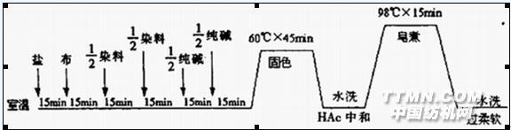 莫代尔针织布一般采用活性染料进行染色。莫代尔纤维对染料助剂比较敏感,而且对活性染料的亲和能力很强,染料一旦上染就不易移染,很容易产生色花和色斑。可采用三项措施来解决上述难点:第一项是在染缸中先加适量的精盐或元明粉,然后进布在中性盐浴中充分转匀,再缓慢分次加入染料,以保证莫代尔纤维在中性盐浴中缓慢接触染料,保持上染速率的温和平衡,从而避免了色花和色斑现象;第二项是选择重现性、配伍性及匀染性好且对莫代尔纤维直接性中等的染料,综合考虑性能价格比等因素,选用上海染料化工八厂的EF型染料,大大减少了莫代尔针织布的返修率,因而在一定程度上解决了莫代尔针织布返修困难的问题;第三项措施是采用香港立信公司的常温溢流喷射染色机进行染色,较大程度地保证了染出布匹的质量。下面以实际生产情况举例说明。1.2.1咖啡色染色配方举例(O.W.f) 活性黄EF—R(%) 1.5 活性红EF一6B(%) 0.5 活性蓝EF一2G(%) 0.25 精盐(%) 60 纯碱(%) 20 浴比:1:12 温度:40℃升至60℃ 时间:60min
