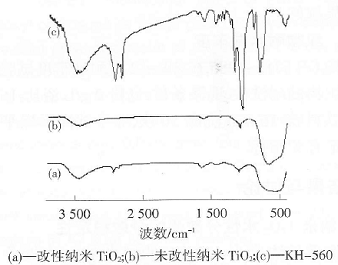| 图2 改性前后纳米TiO2及KH-560的红外光谱图 |