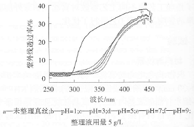 | 图4 不同pH值的 纳米分散浆整理前后真丝的紫外线透过率 |
