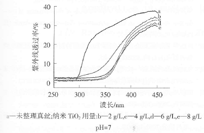 比较图5中各曲线可看出,少量的改性纳米TiO2水分散浆具有明显的紫外防护效果,并且随着整理液中纳米TiO2用量的增加,真丝织物的抗紫外性逐渐增强。表2中,当TiO2用量为