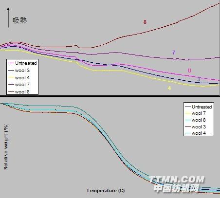 圖中7號和3號樣品之熱重曲線幾乎完全重叠, 說明平整和折邹織物的熱性能差別不大. 八號樣品因為已脫水, 所以與四號樣品之曲線有所不同. 由于处理前后样品表现出来明显差距,亦证明PU与羊毛纤维的交联反应的产生是存在的,但还需要进一步证实;DSC 圖中各樣品於約100 度時先有一個水蒸發的吸熱峰, 再於210 度時有另一個放熱峰, 該放熱峰於約340 度時完結, 及後樣品再無特別的變化。初步認為該放熱峰可能是羊毛結晶峰,但還需進一步的研究文獻。