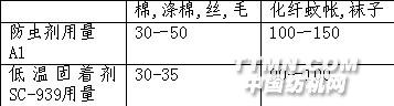 化料操作:(以配制500升溶液为例)首先在化料桶内加入300-400升水,开动搅拌器,加入防虫整理剂A1,然后加入低温固着剂SC-L,加水至500升,继续搅拌。