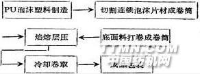 一、焙熔层压织韧的生产工艺分为三大步骤l、PU泡沫塑料的制造;2、泡沫片材制取和底面料打卷;3、焰熔层压。工艺流程示意图;