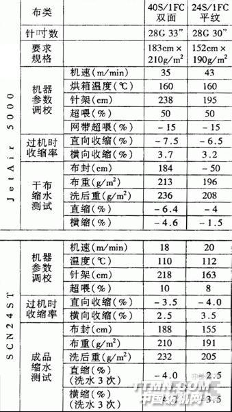 针织行业一直在寻求解决针织物尺寸稳定性和服用性问题,盼以最低成本生产高质量的针织服装。现在消费者对针织产品要求越来越高,就布的外在品质有:门幅、布重、循环间距、斜度、纹路、污渍、痕类疵点、手感等等;对织物内在品质要求有:洗后布重、洗后间距、缩水率、扭度、甲醛含量等等,其中又以缩水率问题为整理的技术核心,要求的剩余缩水率越来越低,比如在5%以下。除了对产品质量提高,还要求工艺及产品必须环保,而传统的树脂整理工艺根本不能达到环保的要求。为了解决这一矛盾,也为了节省能源降低成本,立信门富士制造出连续不间断的松式烘燥整理JetAir5000系列配套设备,用之提高针织物总体性能。一、关于棉针织物防缩的基本原理1、棉针织物的基本结构是线圈,正面与反面的线圈相互套结,正面与反面线图的构成比例、张力,形成各种类形的结构,如单面布、双面布、珠地、螺纹等,每一个结构的针织物线圈总会有一个最稳定的状态,只有在此状态下,线圈才不会再收缩,织物的缩水表现才为最佳。2、在没有外力作用下洗水后再干燥,线圈始终有回复到其较稳定状态的趋势。3、针织物在织造、煮漂、染色、以及其它前工序中,不断受到外界的作用力(直向拉力、湿度与温度的综合因素),织物的线圈会变形,偏离了其最稳定的状态。因此,在后整理时要将线圈尽量回复其最稳定的状态(此时织物的缩水率最为理想),这就是后整理的重要任务。4、织物在煮漂染的潮湿条件下不断运行,线圈在被拉长的同时,纱线的纤维受到磨擦,形成互相纠缠,如不采用任何手段而把织物烘干,纠缠的死结在往后的工艺也没法松开,织物无法回复到最稳定的状态,缩水率高。5、要让线圈回到最稳定的状态,降低剩余缩水率,有下列途径:A、减少针织物在织造、染色、整理过程中的张力,使线圈尽量不偏离其最稳定状态。在选购染整设备时,必需考虑织物在过程中产生的张力。B、预缩工艺。C、低缩率环保工艺流程。二、预缩工艺1、高温