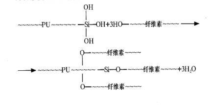 有机硅改性聚氨酯抗皱整理剂DF-816,就是一种交联性的抗皱整理剂,每个端基都含有三个活泼的硅羟基(Si0H),硅羟基(Si0H)与纤维素结构中羟基(-0H)在加热的过程中,进行脱水反应,形成交联网络结构,基本反应为: