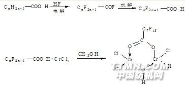 全氟羧酸铬络合物的合成 该络合物的制备先是在电解槽中,以无水氢氟酸为溶剂或氟化剂,使脂肪酸经电化学氟化反应生成全氟羧酰氟,再经水解而制得全氟羧酸(CnF2n+1-COOH),然后由全氟羧酸和三氯化铬再甲醇液中生成全氟羧酸铬络合物。化学反应如下:
