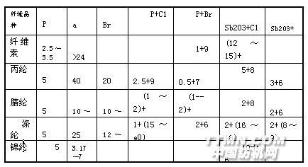 现,对纤维产生阻燃作用的主要元素有硼、磷、氮、溴、氯、锑、铋、氟、碘等,其中效果较好的是含磷、溴、氯等元素的化合物。用两种以上元素混合化合物作阻燃剂时,其阻燃效果比单一元素化合物好。表6—10列出了部分纤维阻燃元素的最低量。