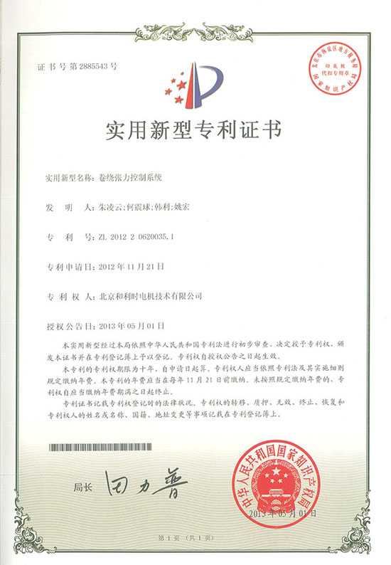 近日,北京和利时电机公司荣获中华人民共和国国家知识产权局颁发的"卷绕张力控制系统"实用新型专利证书,专利号:ZL 2012 2 0620035.1。