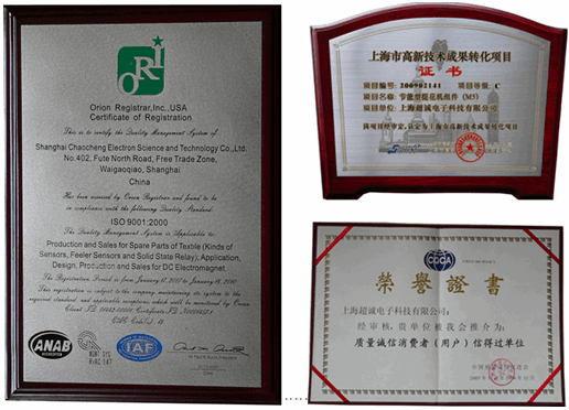 超诚电子科技有限公司在产品开发领域:成功研发出提花机电磁铁、抬纬电磁铁、电子多臂机电磁铁、储纬器电磁针、接近开关、纬纱传感器、光电开关、光电探纬器、固态继电器等产品,部分产品获得了国际UL认证、CE认证等,受到了国部委的多次嘉奖。特别是本公司的高频率提花机电磁铁(SZT-003)、电子多臂机电磁棒(SZT-001-20)、节能型提花机组件(M5)、新型气阀电磁铁(TAU-2536),成为了国家商新技术产品,并通过了上海市高新技术成果转化,得到了国家重点产品保护,本公司也被确认为全国质量、信誉双保障示范企业,中国质量诚信委员会AAA级质量诚信会员,中国质量诚信促进会质量诚信消费者(用户)信得过单位。