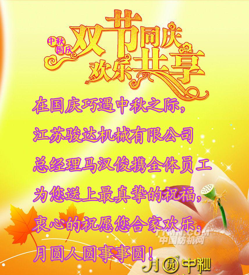 在国庆巧遇中秋之际,江苏骏达机械有限公司总经理马汉俊先生携全体员工为您送上最真挚的祝福,衷心地祝愿您合家欢乐,月圆人圆事事圆!