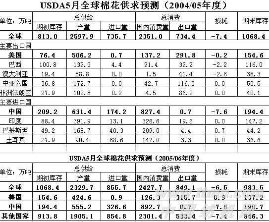 USDA对全球及主要产棉国2004/05年度及2005/06的供求预测数字见下表: