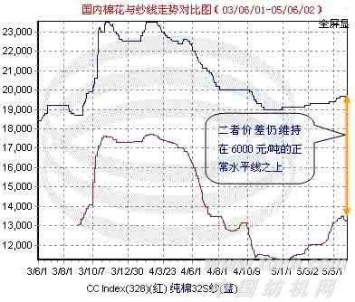 其一,从近几年棉花与纱类行情走势来看,有一个很明显的规律,棉花行情具有主导性,即往往是棉花牵着纱线的鼻子走,纱线虽然在反映节拍上有所滞后,但方向是完全一致的。而纱线一般处于从属地位,很少能摆脱棉花影响而走出独立行情并反作用于棉花。