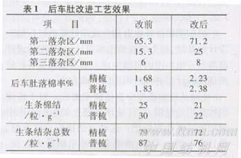 托棉板宽度缩短,落杂区宽度加大,增加了后车肚落棉,减少了糊漏底现象,降低了生条含杂,提高了生条质量。