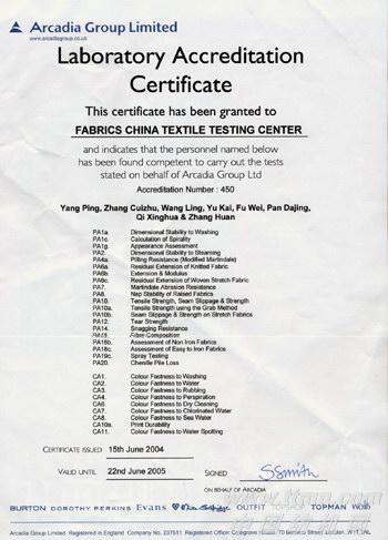 中国流行面料检测中心(Fabrics China Textile Testing Center),继去年获得CNAL(中国实验室认可委员会)认可和奥地利Lenzing公司认可以来,经过一段时间的能力评估,于今年6月15日又获得了英国最大流行服饰集团Arcadia的认可,认可编号是450。这意味着中国流行面料检测中心已经获得在国内为Arcadia Group供应商提供纺织品检测的资格。到目前为止,除ITS外,中国流行面料检测中心是Arcadia指定的第二家委托检测实验室,也是唯一的国内检测实验室。中国流行面料检测中心全体员工愿意为国内纺织贸易提供更为快速准确的测试服务。