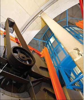 12个200kW离心风机环形安装在塔的底座上,通过Unidrive SP驱动器将他们的速度都锁定到一起,并向中央水平吹风。通过一个航空器型圆锥,中央的气流转向为速度高达250kph(3500000立方米/小时)的垂直气流。塔顶的空气收集器将空气回送到电机供气口,负压也降低了系统的功耗。系统对塔内温度进行监测,如果因电机产生热量,环境温度超过了最佳温度,塔顶的四个110kW通风风机就会排出部分热空气并向系统注入新鲜空气。