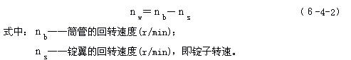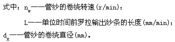 由于加捻过程中,锭翼转速恒定不变,因此采用翼导时,筒管转速随着卷绕直径的增加而增大,致使管纱回转不稳定,动力消耗不平衡,而且断头后,管纱上的纱头在回转气流作用下退绕飘头,易影响邻纱。此外,采用翼导还会因传动惯性而使开车启动时张力增加而导致断头。所以在棉纺粗纱机上,都采用管导式卷绕。在卷绕中,筒管转速与锭翼转速之差为卷绕的转速nw,即