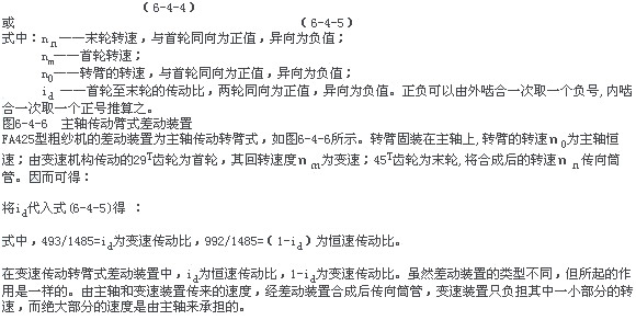 (1)差动装置的速度计算 差动装置位于主轴上,其结构为周转轮系,包括首轮、末轮、转臂三个部分。国产粗纱机的差动装置,根据转臂传动的方式不同,可以分为主轴传动臂和铁炮传动臂两种。无论哪种类型的差动装置都可以用维里斯公式进行计算,即