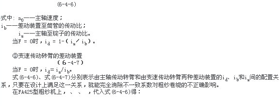 (2)差动装置不一致系数的计算 由式(6-4-5)可知,筒管的速度由恒速部分和变速部分组成,恒速部分等于锭速,变速部分是卷绕速度,其变化规律和管纱的卷绕直径成反比。如果筒管的恒速和锭速不等,其差值就要加入到卷绕速度中去。随着卷绕速度逐层减慢,这个差值在卷绕速度中占的比例逐层增大,从而破坏了卷绕规律,引起卷绕张力的变化,增加了粗纱长片段不匀。筒管的恒速与锭速之差对锭速比值的百分率,称为不一致系数F。当F=0时,说明卷绕规律正常;当F≠0时,则F的绝对值越大,卷绕规律的破坏越严重。两类差动装置不一致系数F的计算公式如下: