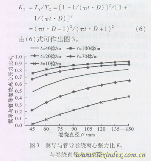 笔者曾推导出,离心张力与筒管转速的平方成正比。设翼导卷绕方式与管导卷绕方式的离心张力之比为KT,则有: