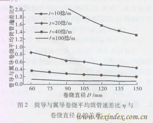 计算结果表明,在离心张力相同、t=40捻/m和满纱的条件下,翼导卷绕方式比管导卷绕方式的锭翼转速可提高12.5%(卷装直径为120 mm)到11.2%(卷装直径为150 mm)。