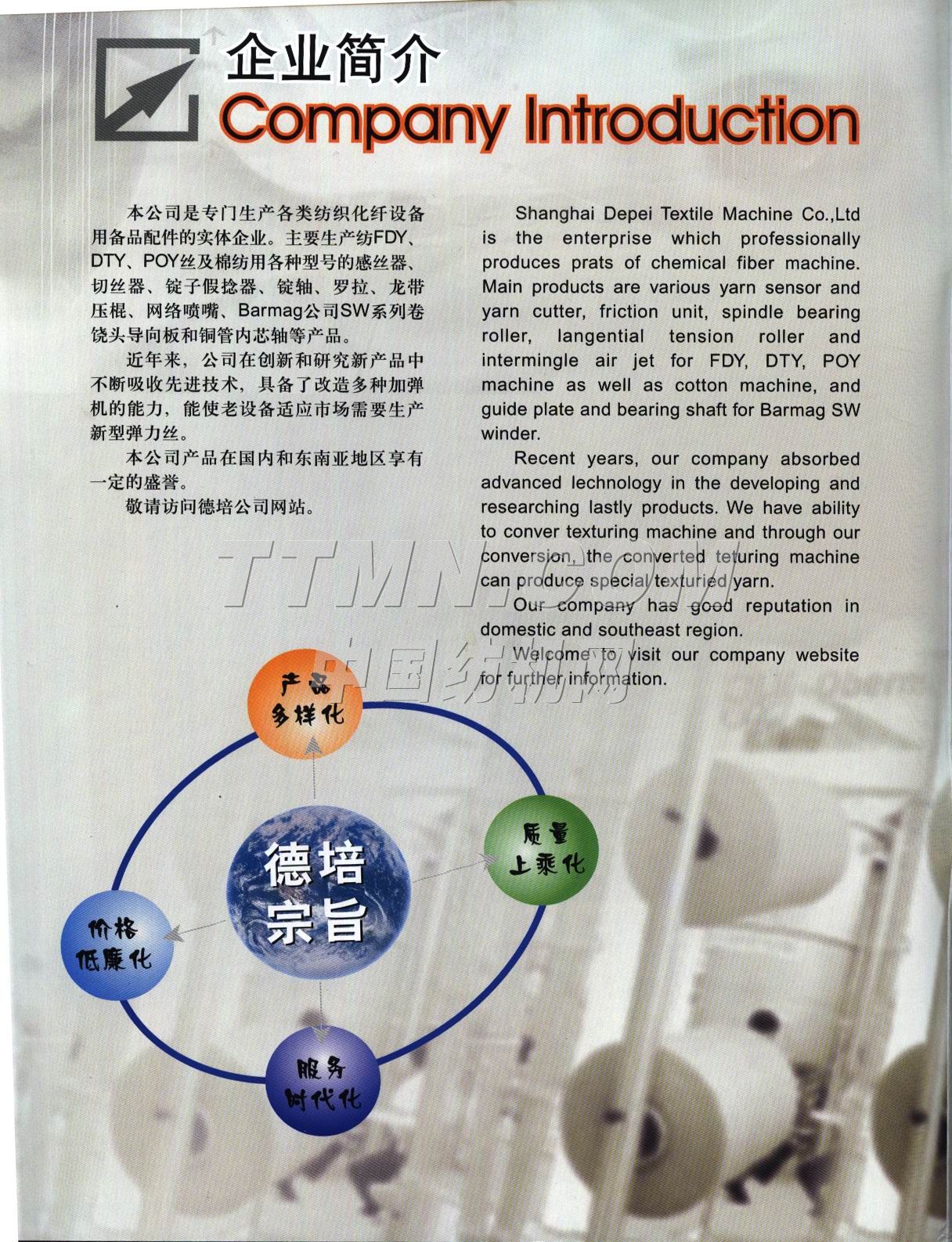上海德培实业有限公司是专门生产各类化纤配件的实体企业,在国内享有一定的盛誉。本公司利用企业重新优化组合的机会,兼并了有十几年生产历史的上海纺织轴承厂,引进了全套加工生产调整纺织的进口流水线,具有年产几十万套连体轴承的生产能力。   公司主要生产各种型号的感丝器、切丝器、锭子假捻器、锭轴、龙带压轮、罗拉等部件,产品有SDF-800超细旦加弹机、ICBT系列、RPR系列、FK6-700系列、FK6-900系列、FK6-1000系列、SDS系列、33H系列、GK系列、IVF-701系列和其他系列部分产品,产品远销东南亚地区。近年来,随着技术力量的增强,公司还具备了改造各种设备的能力,并自行研制和开发了新一代的牵伸假捻变形机,以满足市场的需要。...