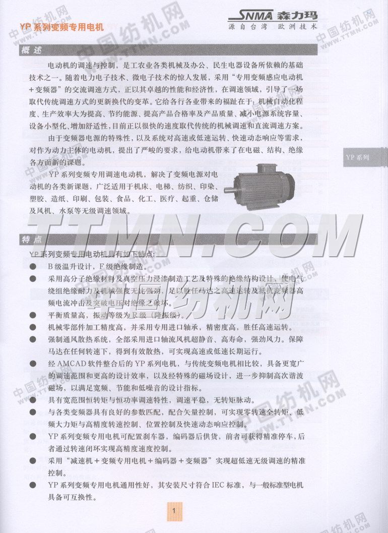 电动机的调速与控制,是工农业各类机械及办公、民生电器设备所以来的基础技术之一。随着电力电子技术、微电子技术的惊人发展,采用“专用变频感应电动机+变频器”的交流调速方式,正以其卓越的性能和经济性,在调速领域,引导了一场取代传统调速方式的更新换代的变革。它给各行各业带来的福音在于:机械自动化程度、生产效率大为提高、节约能源、提高产品合格率及产品质量、见效电源系统容量、设备小型化、增加舒适性,目前正以很快的速度取代传统的机械调速和直流调速方案。   由于变频电源的特殊性,以及系统对高速或低俗速运转、传速动态响应等需求,对作为动力主体的电动机,提出了严峻的要求,给电动机带来了在电磁、结构、绝缘各方面新的课题。   YP系列变频专用调速电动机,解决了变频电源对电动机的各类新课题,广泛应用与机床、电梯、纺织、印染、塑胶、造纸、印刷、包装、食品、化工、医疗、起重、仓储及风机、水泵等无级调速领域。 总公司地址:中华人民共和国台北市中山路290号1602室 电话:886-2-29...