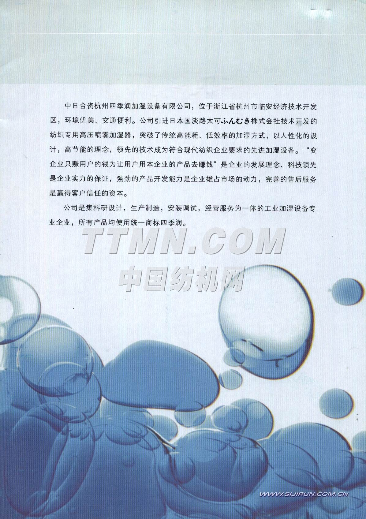 中外合资杭州四季润加湿设备有限公司,位于浙江省杭州市临安经济技术开发区环境优美、交通便得。公司引进日本技术开发的纺织专用高压喷雾加湿器,突破了传统高能耗、低效率的加湿方式,以人性的设计,高节能的理念,领先的技术成为符合现代纺织企业要求的先进加湿设备。“变企业只赚用户的钱为让用户用本企业的产品去赚钱”是企业的发展理念,科技领先是企业实力的保证,强劲的产品开发能力是企业雄占市场的动力,完善的售后服务是赢得客户信任的资本。 公司是集科研设计,生产制造,安装调试,经营服务为一体的工业加湿设备专业企业,所有产品均使用统一商标四季润。 ...
