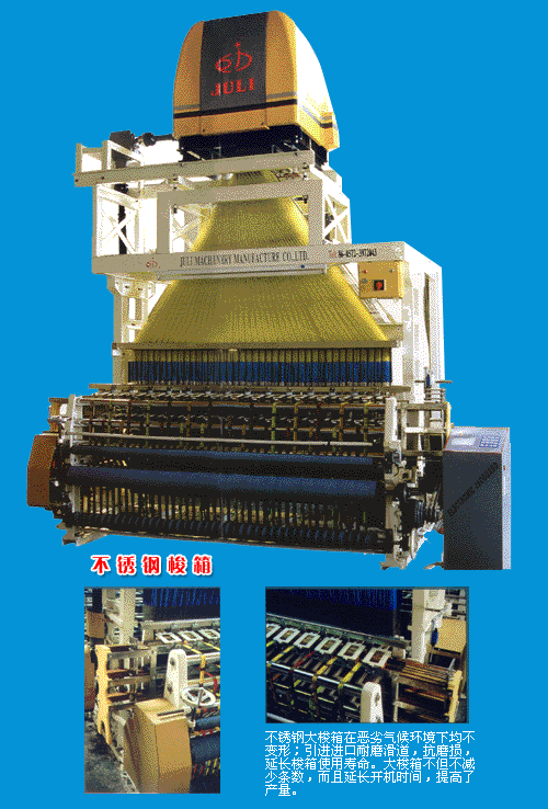 配置电子双开龙头、不锈钢大梭箱、进口瑞士翻边华司弹簧回综、进口材料编织通丝,回转速110-160转/分,根据运转情况可无段调整。