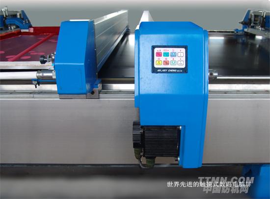 每一印花单元由一高速马达驱动刮刀座 ,刮刀由四个支撑点固定在一主轴上,轴两端由汽缸在线性轴承上滑行,此设计保证刮刀100%的平整刮印,不变形而达到大面积花位均匀压力的稳定印花效果。