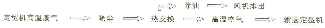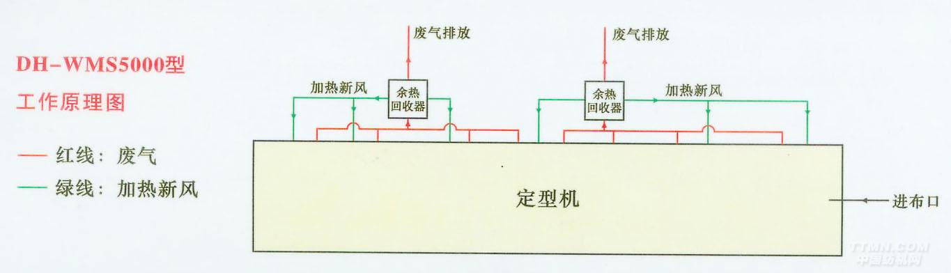 四、工作原理 采集定型机排出的废气热量,通过DH-WMS系列装置处理,将室温(补新风)加热到一定的温度,再直接被充给定型机,使第一、第二节烘房的温度能大幅度提升,并保持住。能使定型机其他烘房减少导热油的进量,并保证烘房所用温度。
