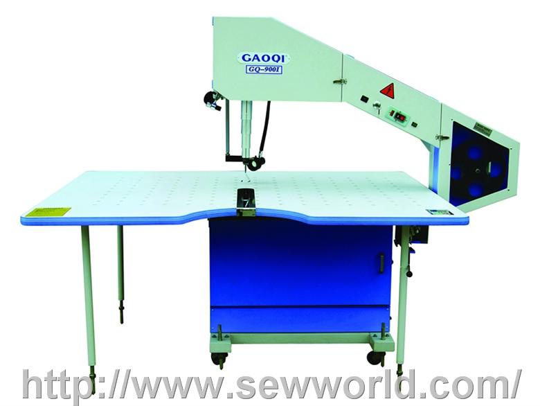 用途: 精确裁剪弯曲度大的裁片及小裁片. 优点: 1.裁剪速度可依不同的布料调整不同的速度加以剪裁. 2.本机裁板附有特殊气浮吹气装置, 可减少裁片重量与裁板形成阻力, 使裁片易于移动, 更精确裁切小裁片. 3.另配备消除毛钩装置, 以使裁刀经过磨刀装置完以后消除裁刀的毛钩, 以利裁刀锋利如新. 4.滚轮采用耐磨橡胶材质, 使裁刀易于固定不致蛇形偏离, 裁刀寿命因而延长. 5.裁刀之换装非常简便, 一般人即可换装. 附有磨刀装置, 可以常保裁刀锋利如新. 6.安全指示(电源一开启即警示灯会亮, 意即告之使用者电源已开启, 以确保安全).